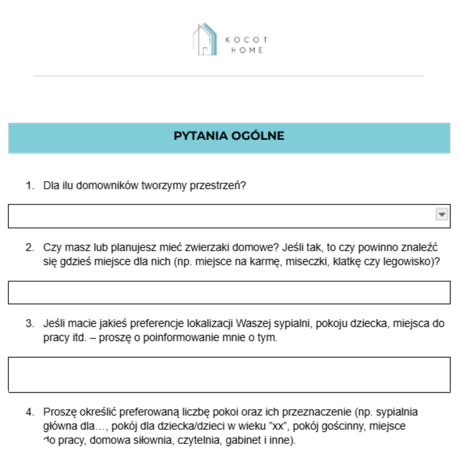 Zestaw pytań otwartych oraz zamkniętych, które pozwolą wspólnie ustalić Twoje oczekiwania dotyczące wnętrza. Ankieta jest podzielona na kilka działów tematycznych, które w doskonały sposób systematyzują i porządkują zebrane informacje.